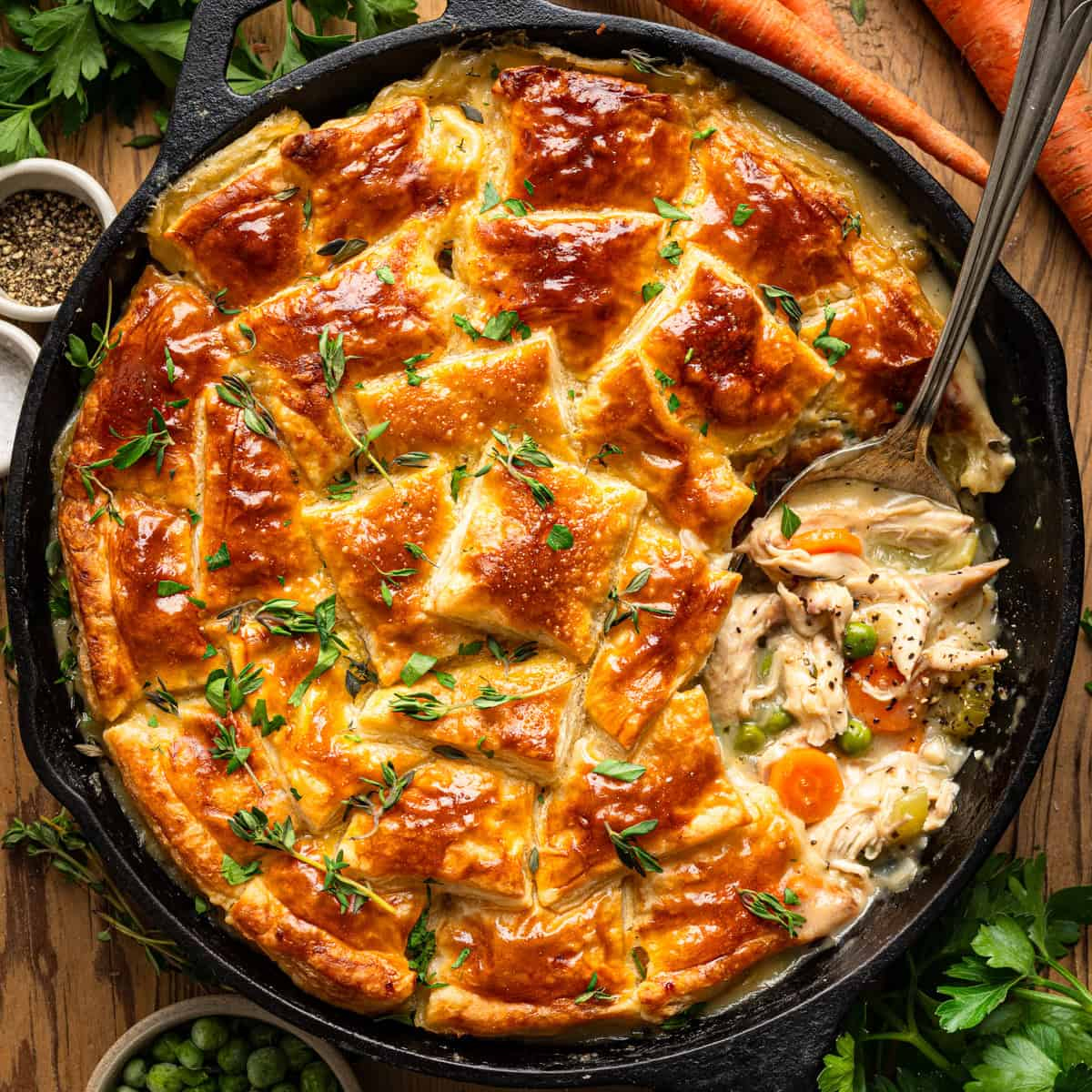 Delightfully flaky puff pastry creates a crispy, buttery crust for our organic chicken pot pie filling.