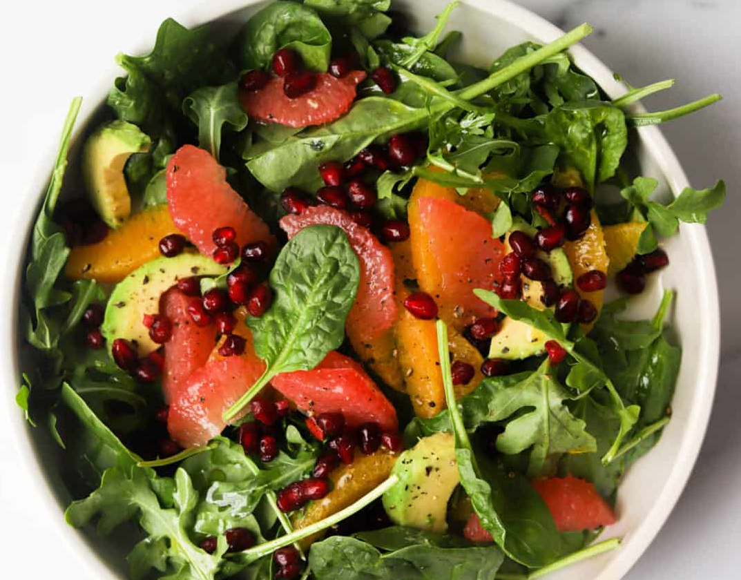 Segments of citrus fruit added to arugula, with pomegranate seeds. Baharat spice vinaigrette.