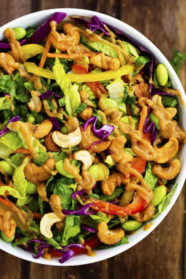 Crispy cabbage & romaine lettuce chopped salad with edamame, carrots, cucumber, cilantro, onions and cashews, served with a peanut dressing and wonton crisps on the side; add any protein to make it meal.