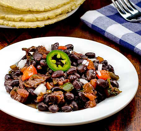 Frijoles charros is a traditional Mexican dish named after the traditional Mexican cowboy horsemen, or charros. Black beans stewed with onion, garlic, and peppers and cilantro. Served with sour cream.