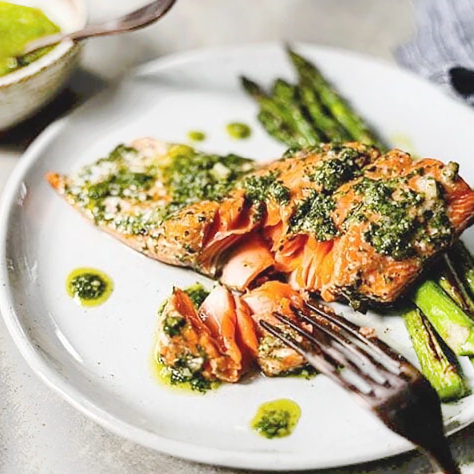 Grilled salmon with chimichurri sauce. Small: Feeds 2. Large: Feed 4-5.