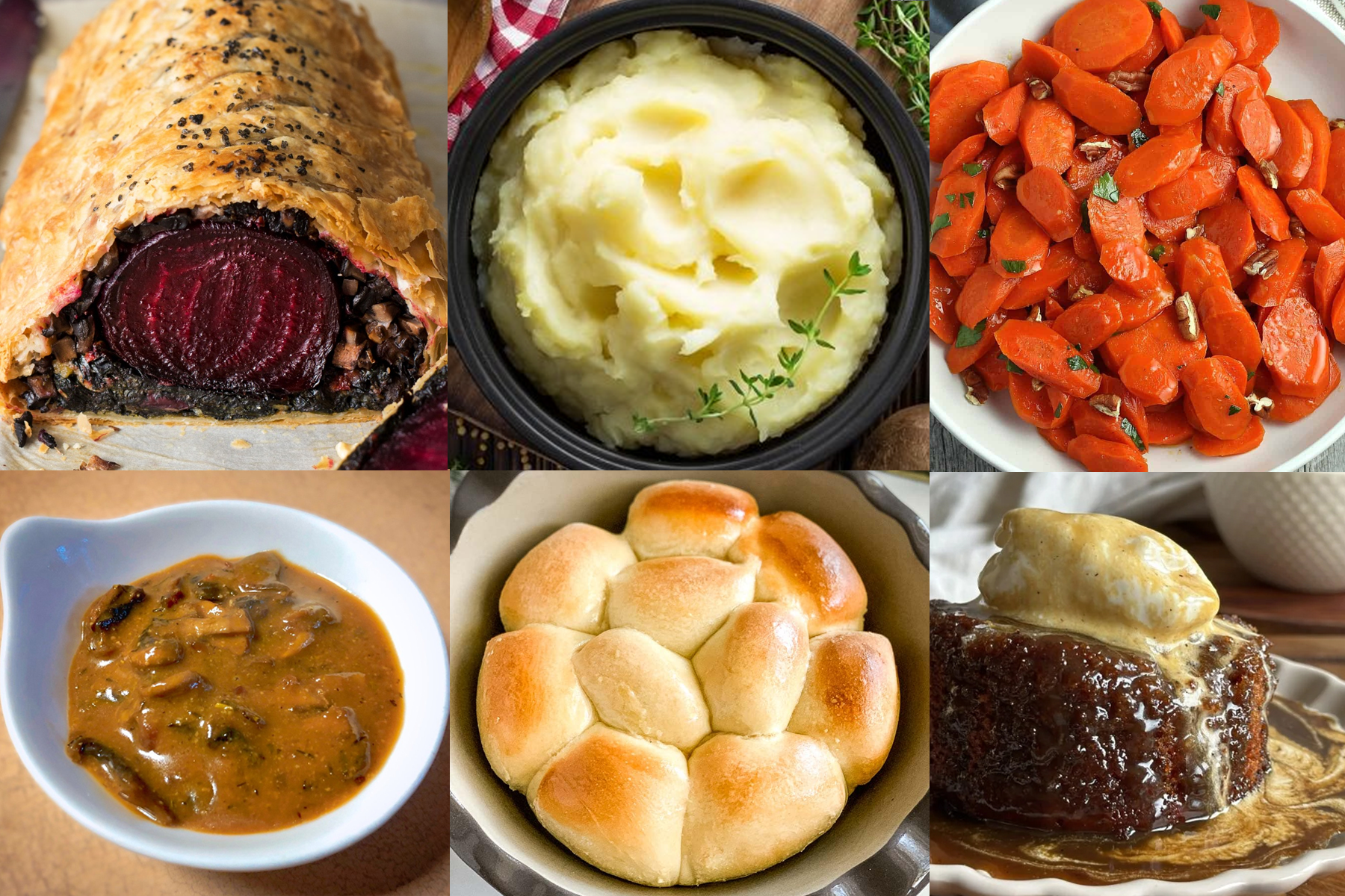 Beet Wellington (Chestnut and Mushroom Duxelles, Mashed Potatoes, Glazed Carrots with Fresh Parsley, Caramelized Onion and Mushroom Gravy, Parker House Rolls, Sticky Toffee Pudding with Eggnog Whipped Cream.