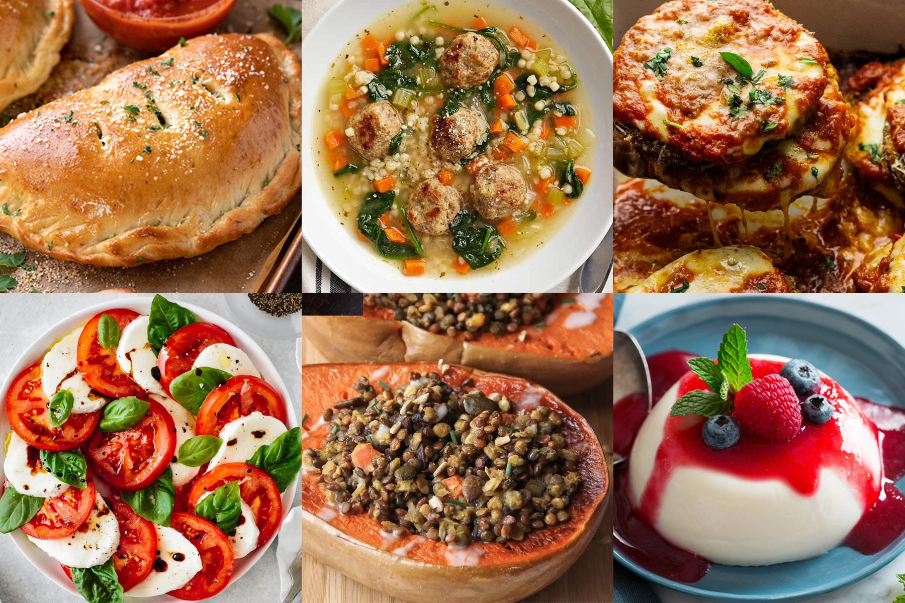 Italian Dinner Package, small orders for each: Calzone, Italian Wedding Soup, Eggplant Parmigiana, Caprese Salad, Chestnut and Lentil Stuffed Honeynut Squash, Panna Cotta. Vegetarian options available.