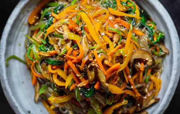 Savory and slightly sweet stir-fried glass noodles with vegetables.
