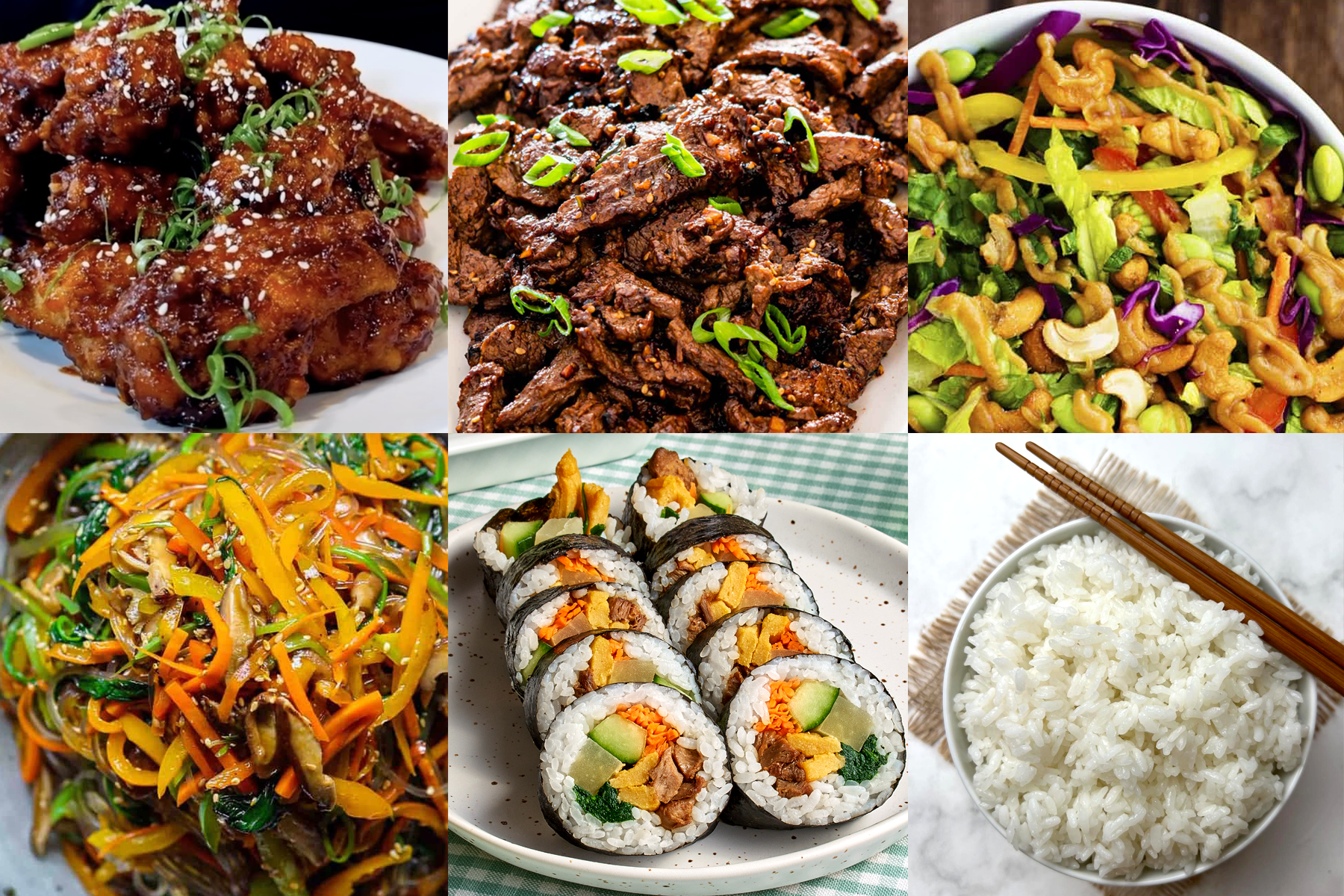 1 small order of each: Korean Fried Chicken (boneless), Beef Bulgogi, Japchae, Gimbap, Crunchy Cashew Salad, White Medium Grain Rice, and OMG Yum Red Chili Schug (Medium Spicy). Serves 4.