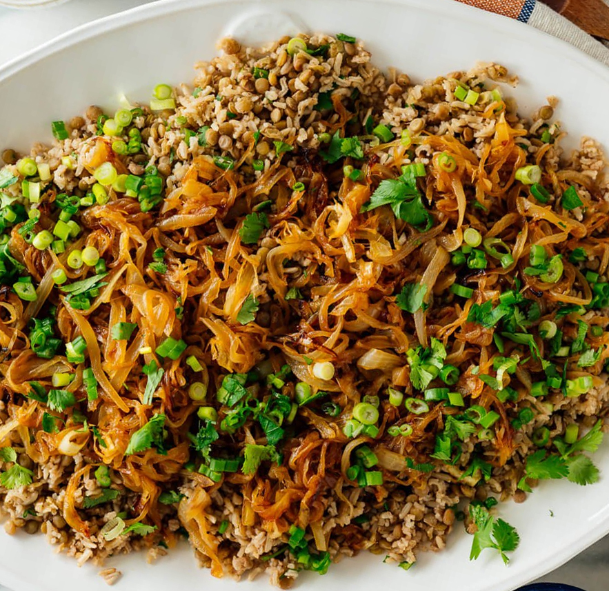 Basmati rice with caramelized onions and lentils.