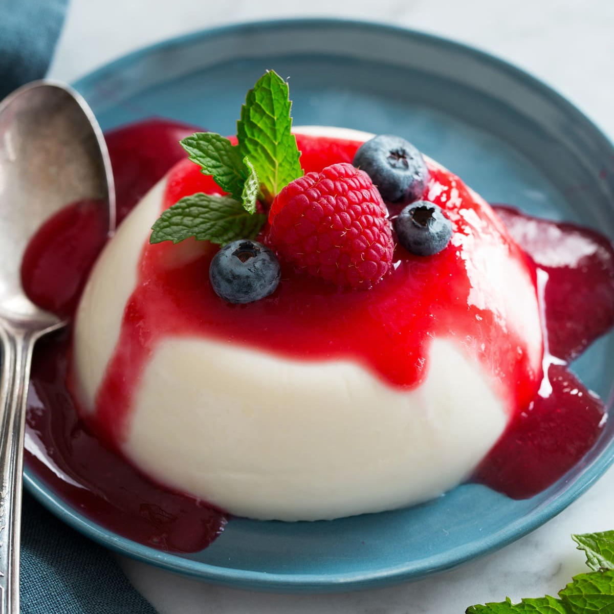Our silky, custard-like texture panna cotta is delivered with fresh seasonal berries on the side. One size, serves two.