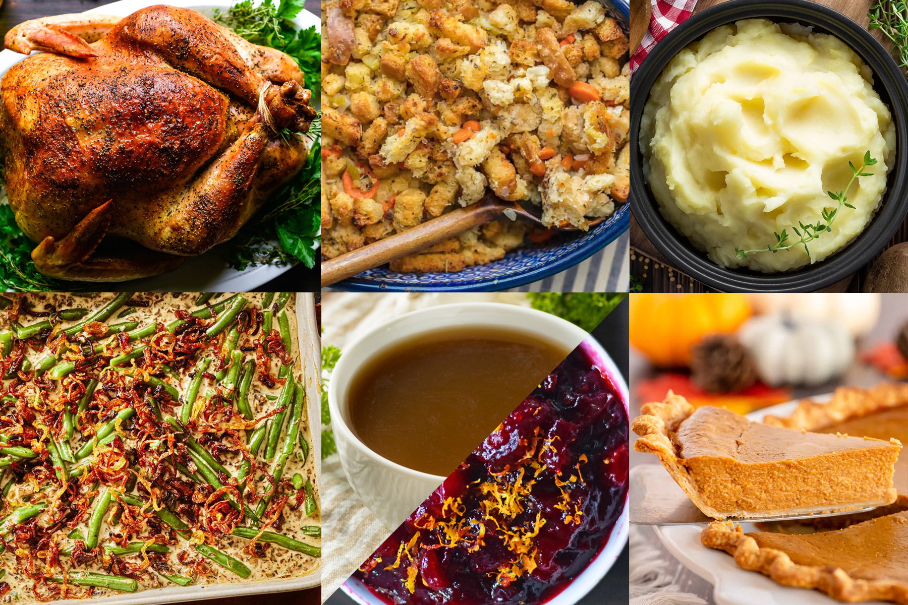 Traditional Thanksgiving Dinner Package: Whole Roasted Turkey, Gluten-Free Bread Stuffing, Mashed Potatoes, Green Bean Casserole, Turkey & Mushroom Gravy, Cranberry Sauce, and Pumpkin Pie.