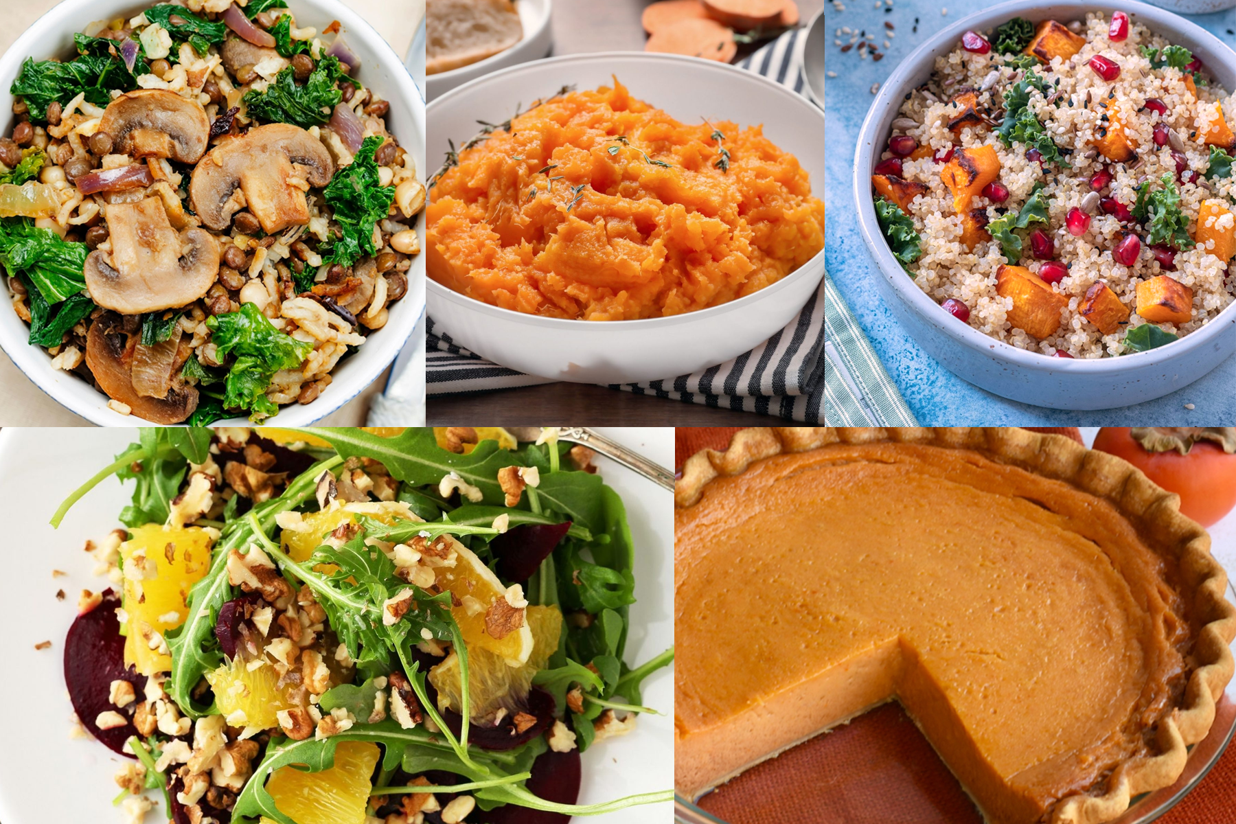 Vegetarian Dinner Package: Chestnuts & Mushrooms Lentils, Mashed Sweet Potatoes with Almonds and Goat Cheese, Pomegranate Quinoa Tabbouleh with Butternut Squash, Beets & Orange Salad, and Gluten Free Pumpkin Persimmon Pie.
