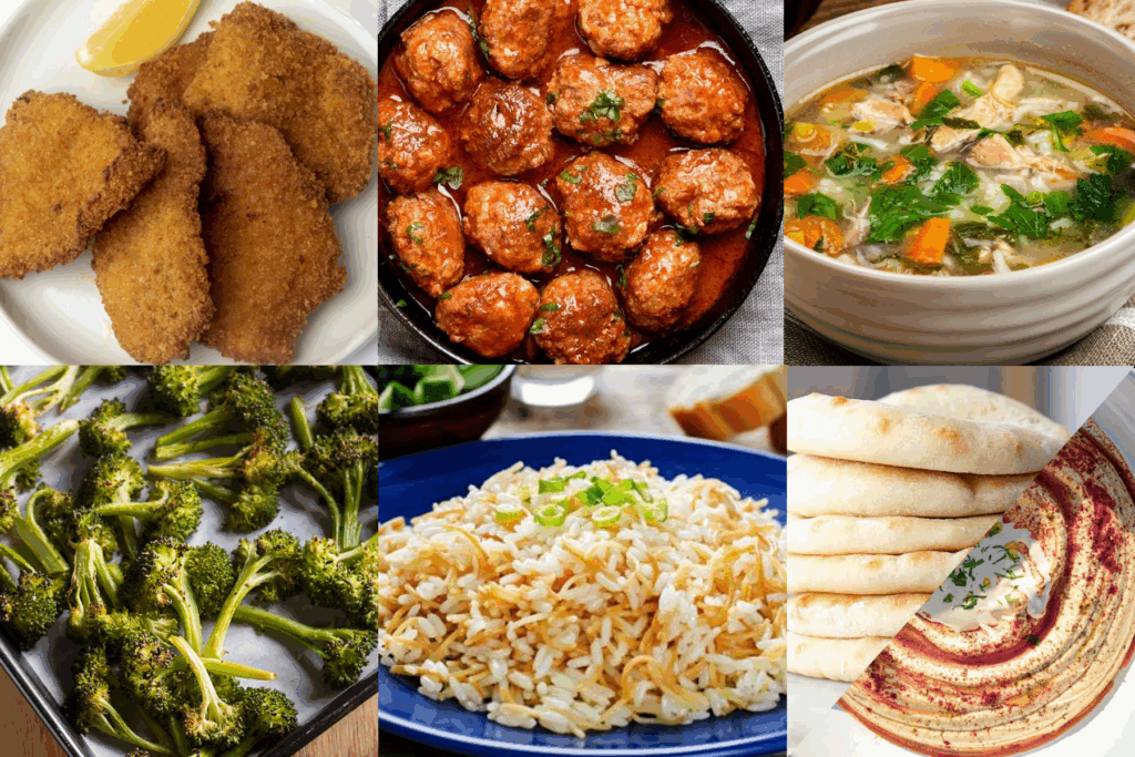 Mediterranean Favorites Family Meal incl. Chicken Schnitzel, Beef Meatballs in Tomato Sauce, Chicken Herb Soup, Roasted Broccoli, Rice Pilaf, PIta & Hummus