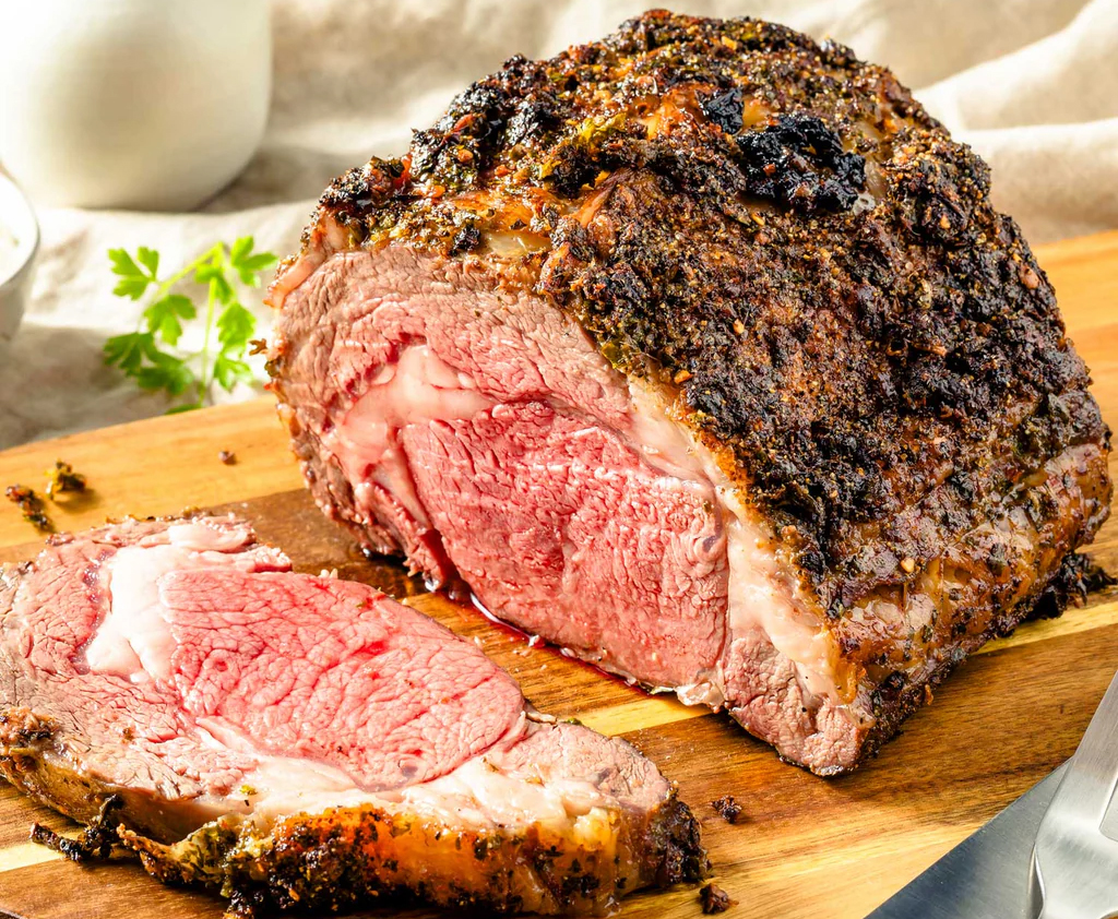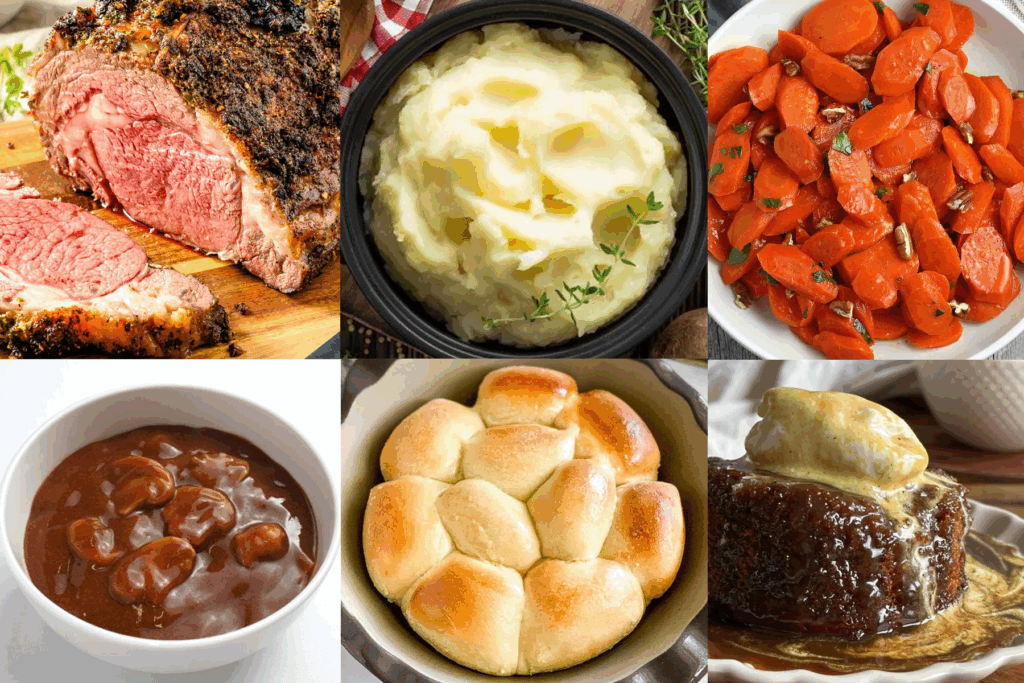 Holiday Prime Rib Dinner incl Prime Rib with au jus & horseradish, Mashed Potatoes with Demi Glace Mushroom Gravy, Glazed Parsley Carrots, Parker House Rolls, and Sticky Toffee Pudding with Eggnog Whipped Cream