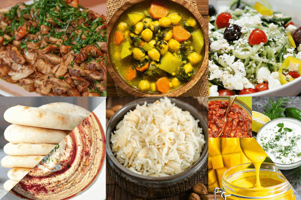 More Mediterranean Favoriites incl. Mejadra, Red Chili Schug, Fattough Salad, Vegetable Tagine, and Eggplant Lentil Siniyah
